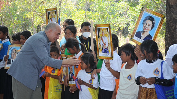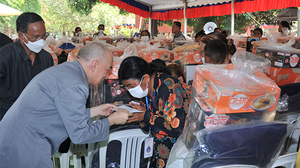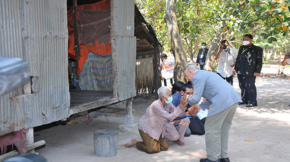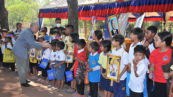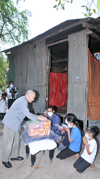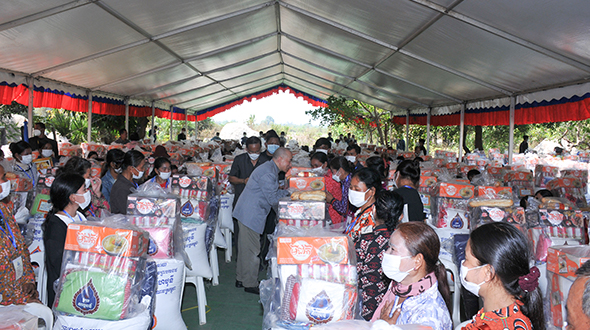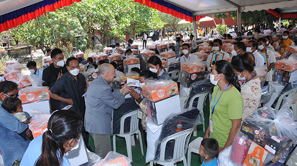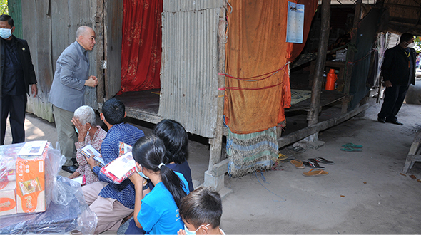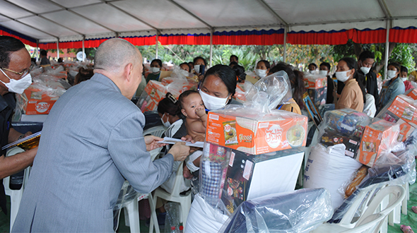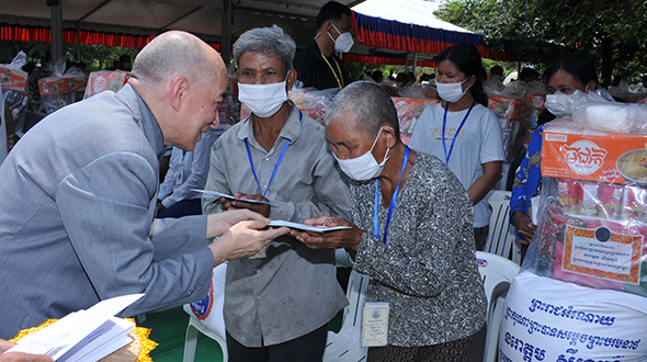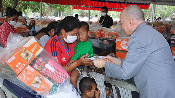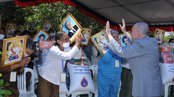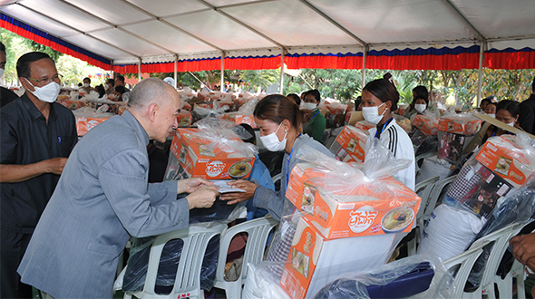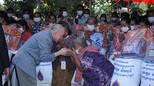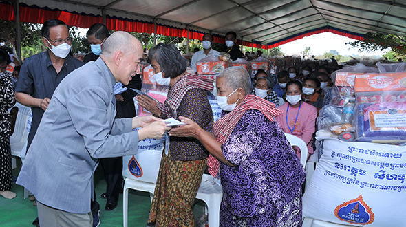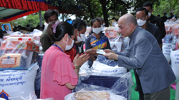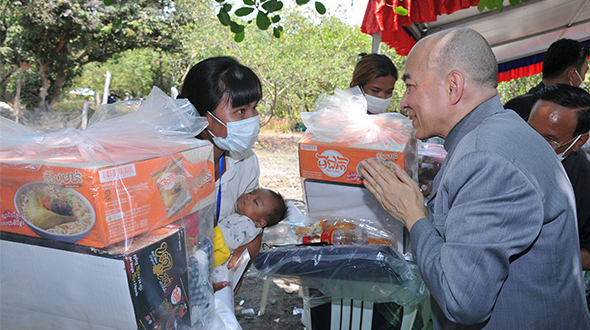 En déplacement dans le district de Banteay Srei, province de Siem Reap, le 22 mars 2023, Sa Majesté le Roi NORODOM SIHAMONI du Cambodge a rendu visite aux familles les plus démunies et a distribué à chacun et chacune des 350 chefs de famille paysanne des dons : 50 kg de riz décortiqué, 60 sachets de vermicelle, 10 boîtes de sardines, 10 masques, une moustiquaire, une tente, une couverture, une paire de sandales, un sarong, un krama, un T-shirt et cent mille Riels.