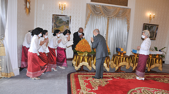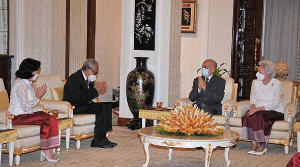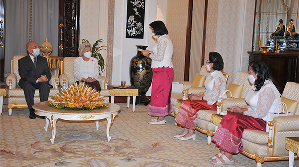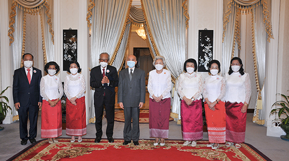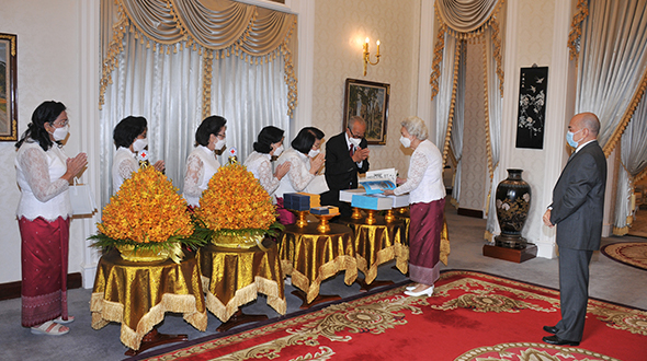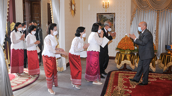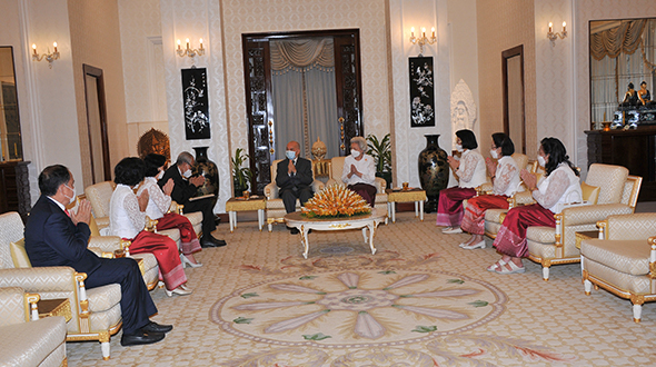 Le 7 juin 2023, au Pavillon Khémarin, Sa Majesté le Roi NORODOM SIHAMONI du Cambodge et Sa Majesté la Reine-Mère NORODOM MONINEATH SIHANOUK ont reçu en audience une délégation de la Croix-Rouge Cambodgienne, conduite par Samdech Chaufeaveang Kong Sam Ol.