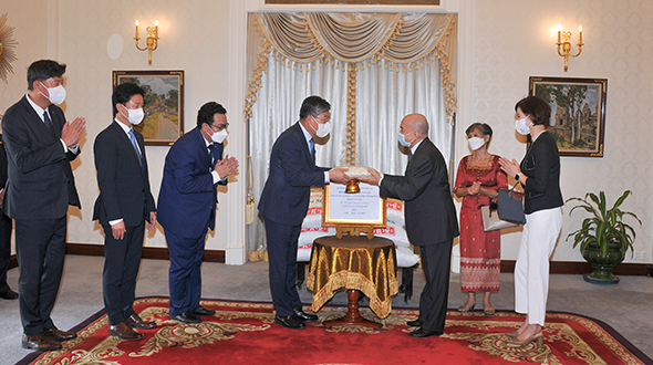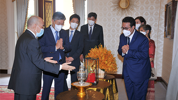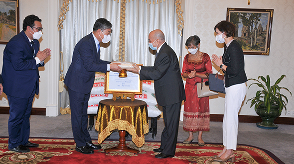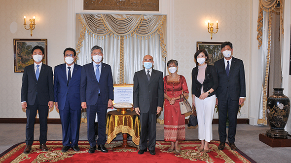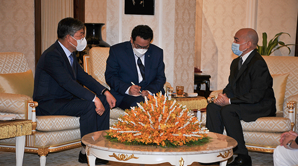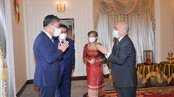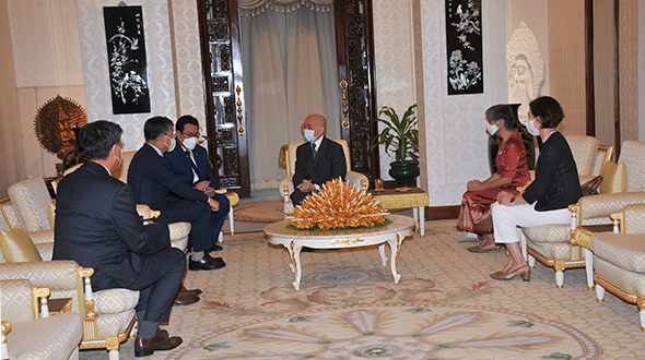 Le 10 juin 2023, au Pavillon Khémarin, Sa Majesté le Roi NORODOM SIHAMONI du Cambodge a reçu en audience une délégation de la banque coréenne DGB, conduite par S. Exc. Mme Oum Marisa. La délégation a contribué dix tonnes de riz décortiqué aux œuvres caritatifs de Sa Majesté le Roi.